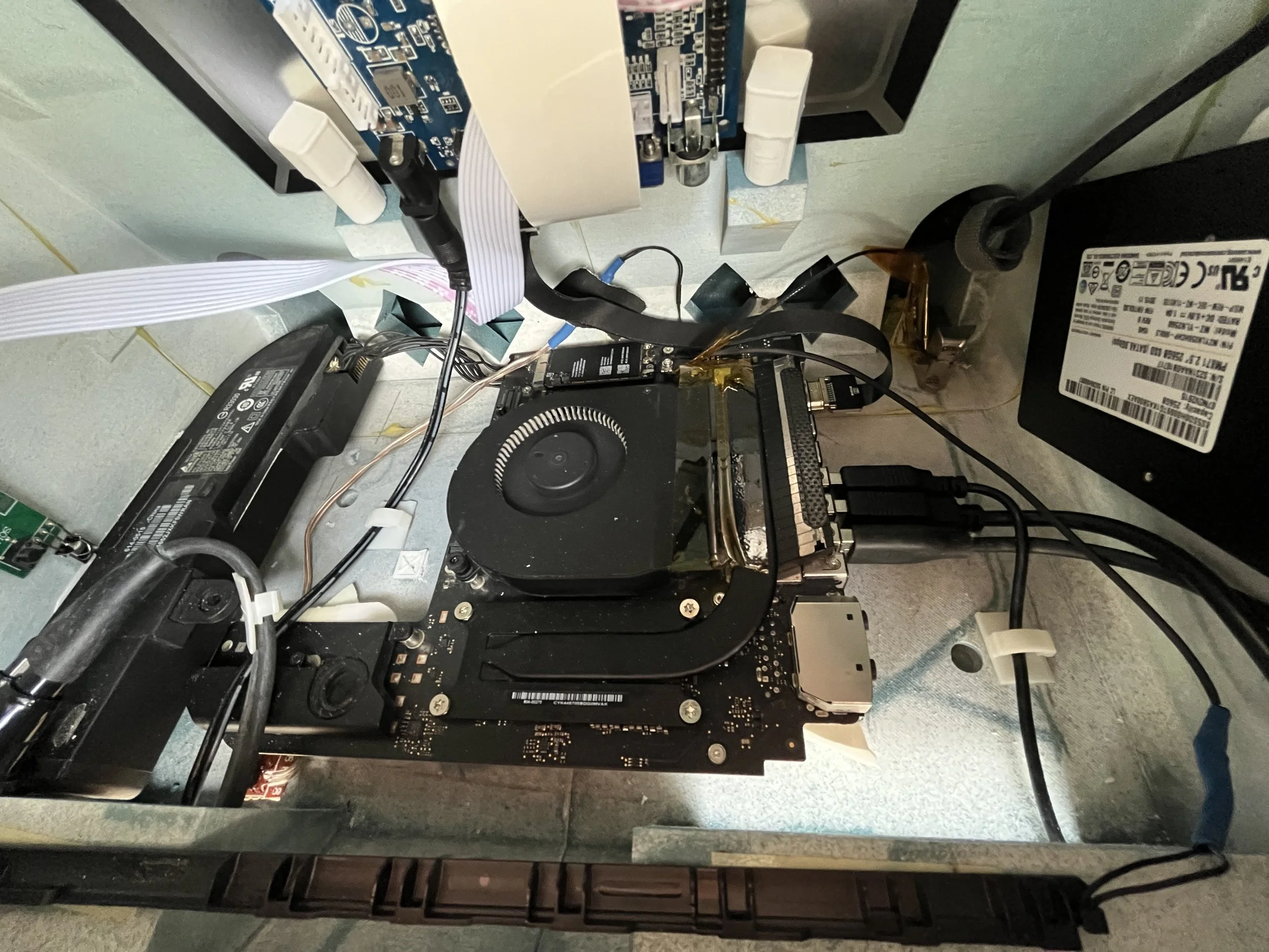 I saved several of these older Mac Mini computers from the trash, and they have significantly more horsepower than old Raspberry Pi’s. I had to completely disassemble and “frankenstein” the guts of the Mac Mini to cram them inside the 3D printed chassis of the terminal replica, but the horsepower boost was significant and well-needed. I threw a copy of Linux on the Mac Mini, and essentially have it doing the same tasks as the Pi 3. I had to extend the Mac Mini’s original power button to the outside of the chassis using some carefully soldered jumper wires. Rather than use the Mac Mini’s bulky WiFi/Bluetooth antenna, I ended up using an antenna taken from a junked MacBook Air chassis I had lying around (it fit better in the plastic case). I also couldn’t get the Mac’s stock SSD to fit nicely inside the tight confines of the 3D printed housing, so I instead opted to stick a USB 3 to SATA SSD adapter inside the case as a kludge.